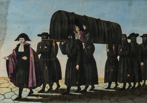 La Misericordia di Firenze è una confraternita laica nata in epoca medievale con scopi solidaristici. Mettendo in pratica i più elementari principi di carità cristiana si propone di aiutare chi versa in stato di necessità. Uno dei servizi più antichi dell’Istituzione riguarda l’organizzazione del soccorso sanitario mediante il trasporto di persone incidentate in ospedale o, se richiesto, al loro domicilio. Diversa è la prassi nel caso di trasporto di un incidentato deceduto: anticamente, a differenza di oggi, il corpo veniva portato generalmente all’oratorio della sede e lì deposto in attesa di eventuali parenti. Se poi questi non si presentavano, era la Misericordia stessa occuparsi della sepoltura con tutti i riti religiosi del caso che, soprattutto in tempi di epidemia, richiedevano al Sodalizio degli sforzi umani, economici e organizzativi di non poco conto.